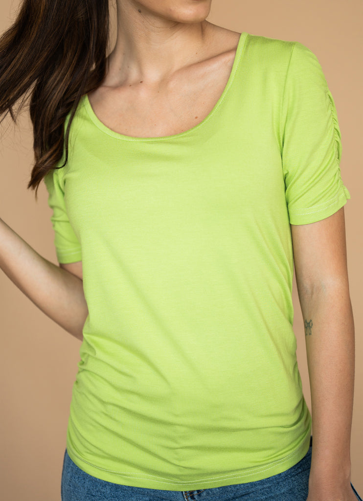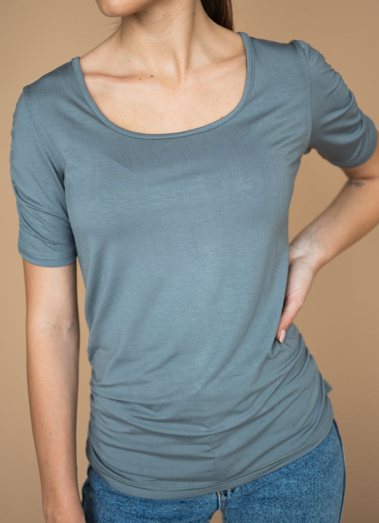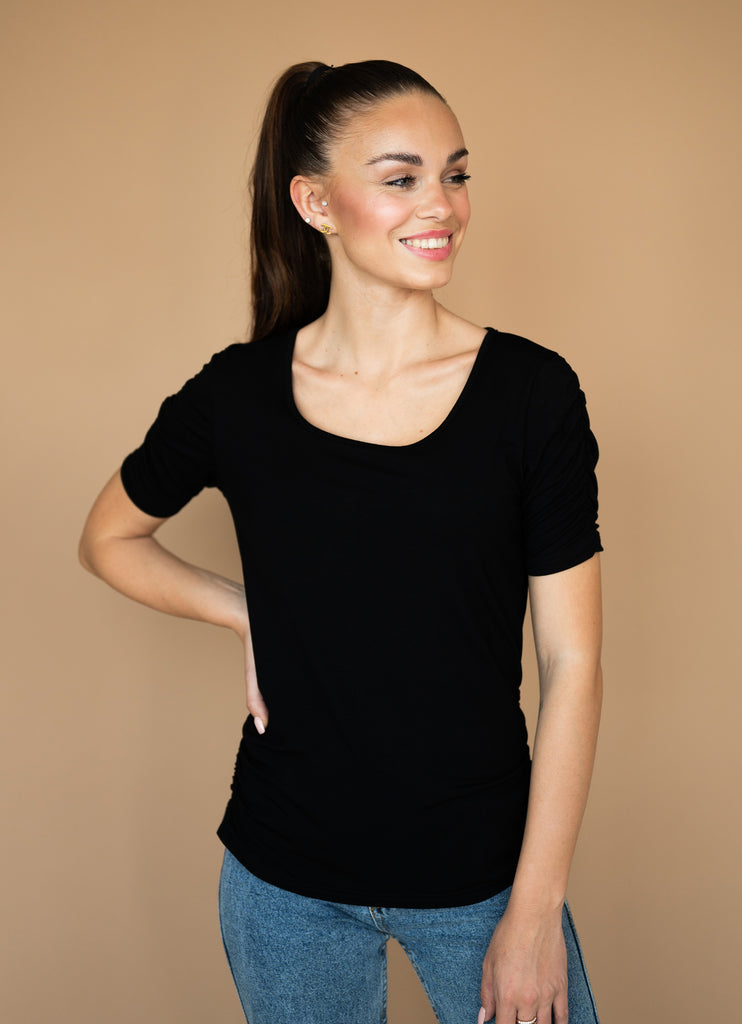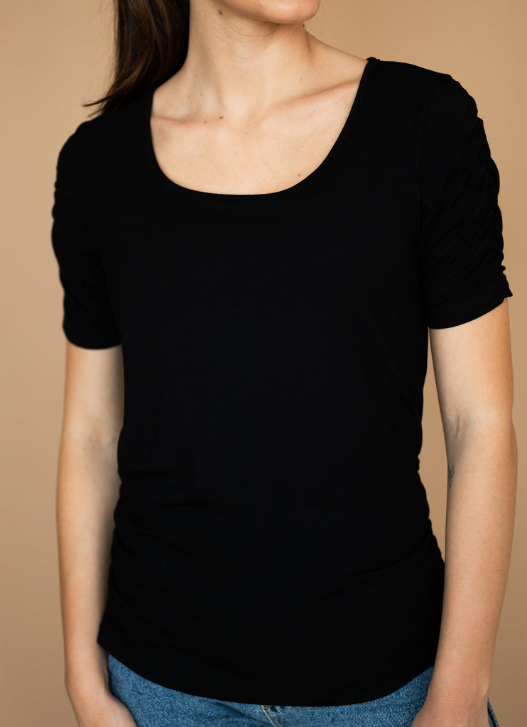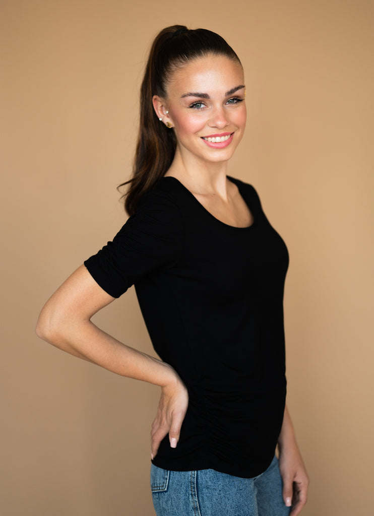 Střih rukávů a boku do gumiček dodá triku zajímavý vzhled a skryje případné nedostatky postavy.