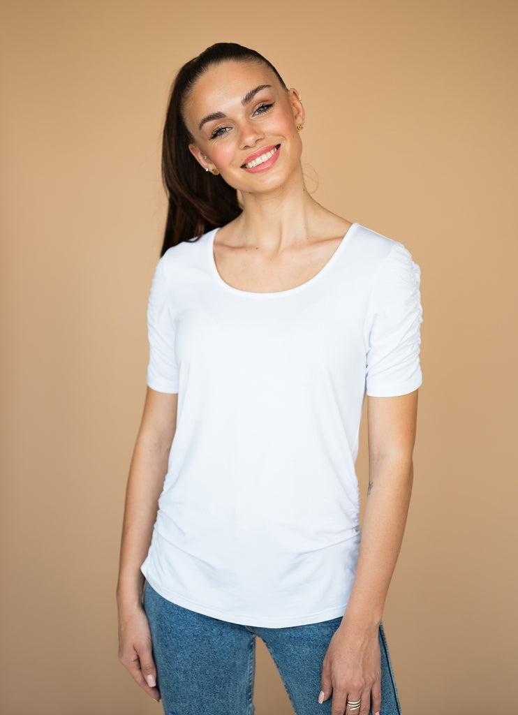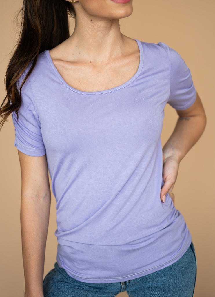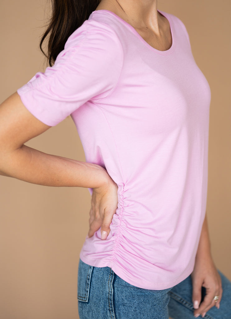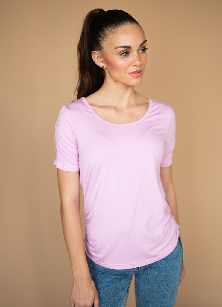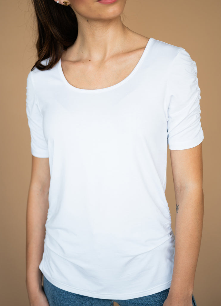 Střih rukávů a boku do gumiček dodá triku zajímavý vzhled a skryje případné nedostatky postavy.